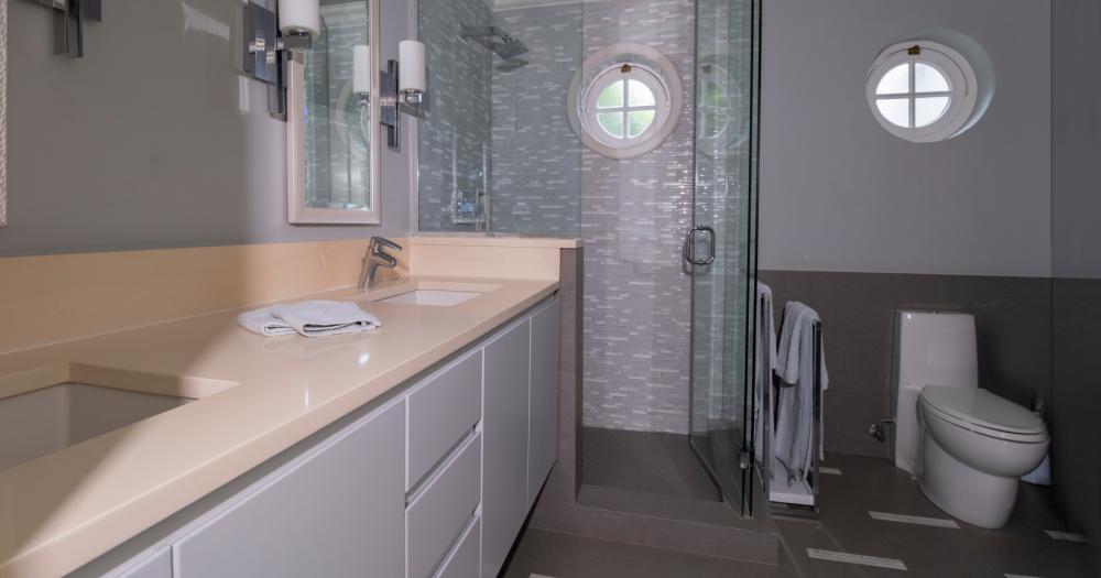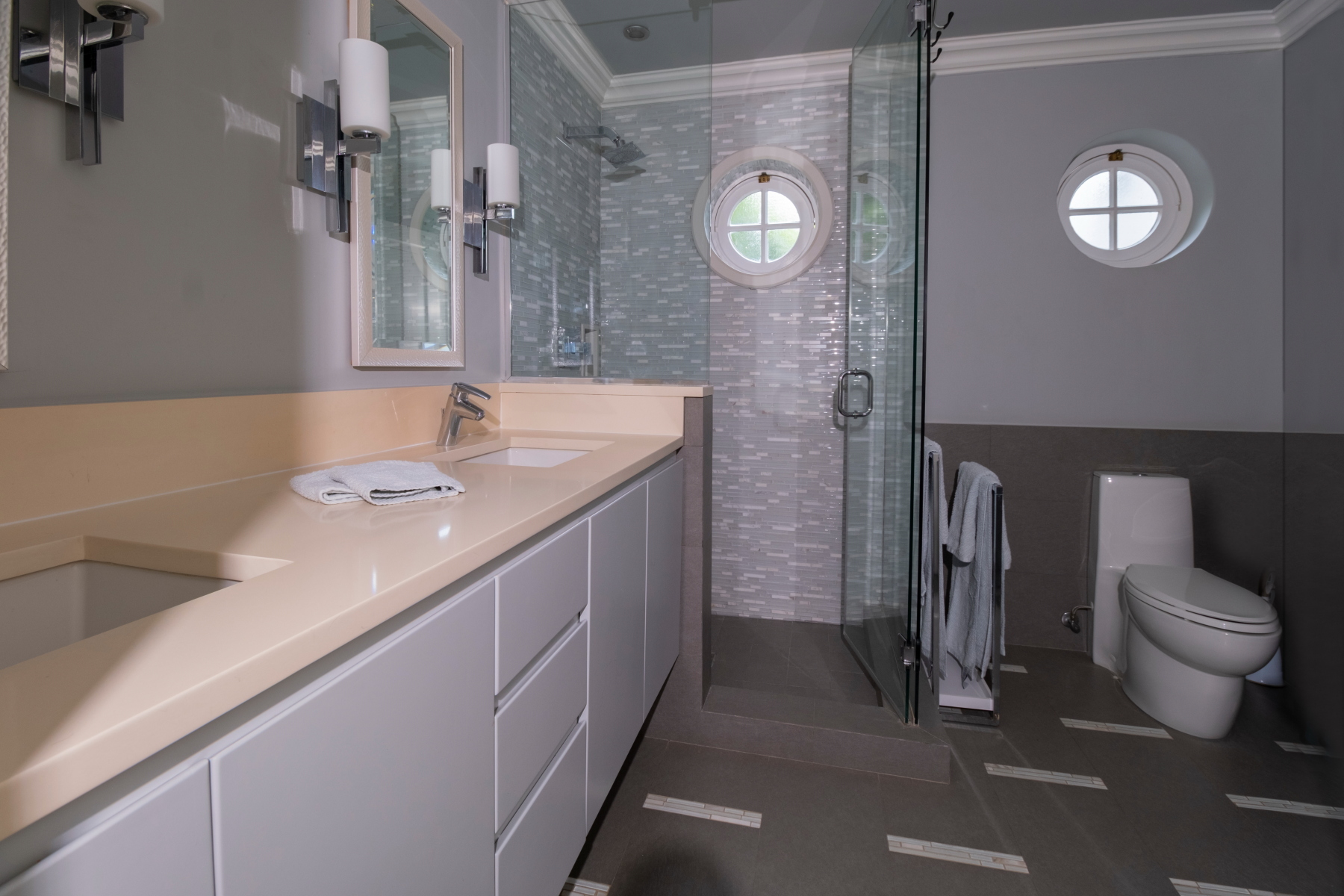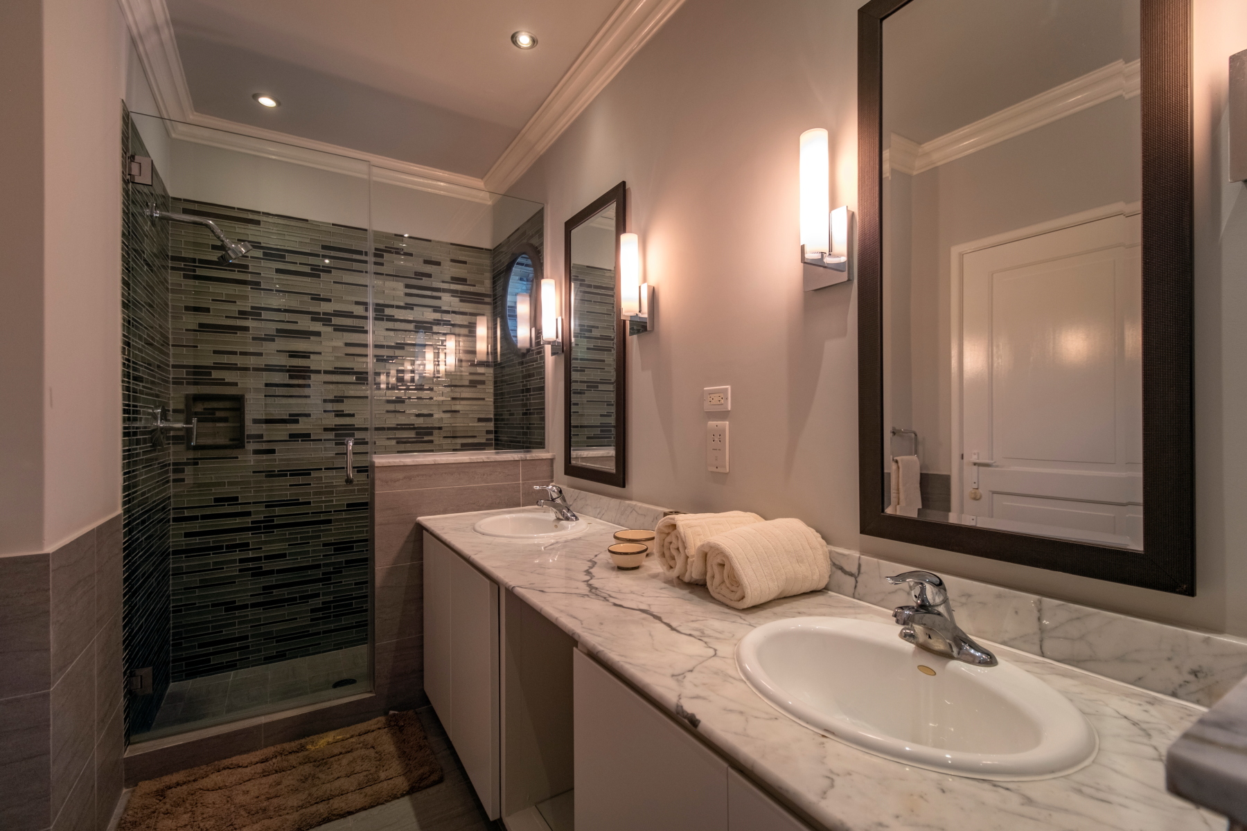 On the lower level, two ensuite bedrooms open directly onto the private pool and sun deck, overlooking a spacious terrace—ideal for families with children. The master suite bathroom also enjoys air conditioning throughout for added comfort. A powder room and laundry are conveniently located on this level.