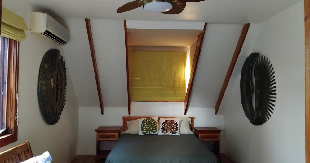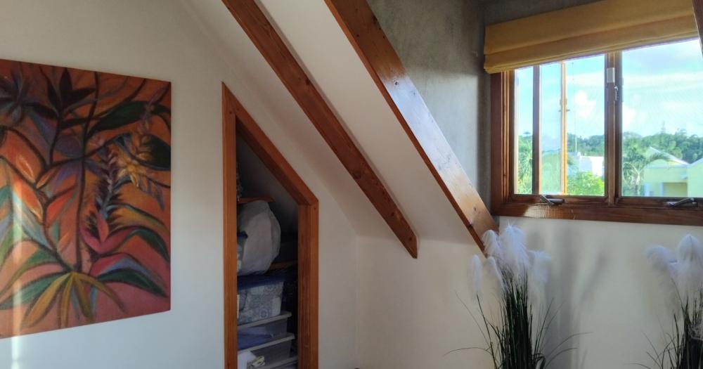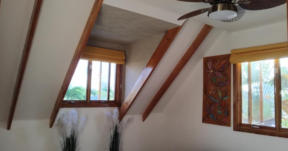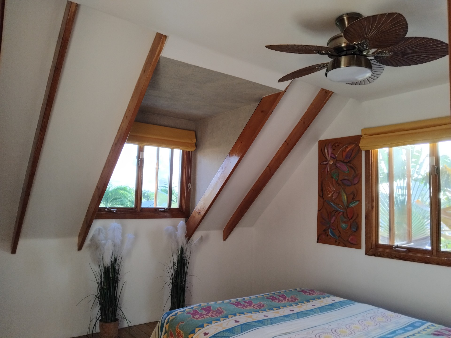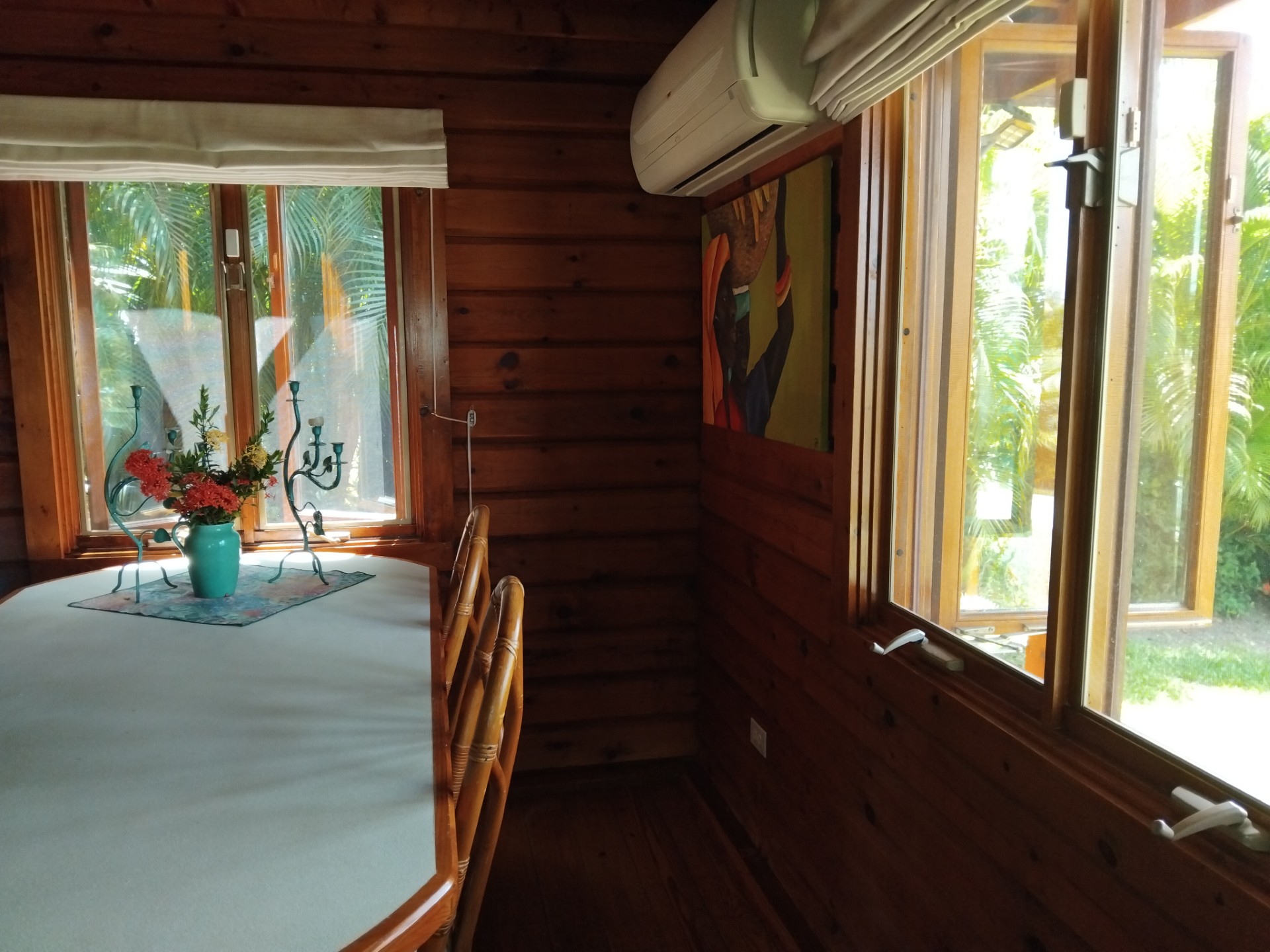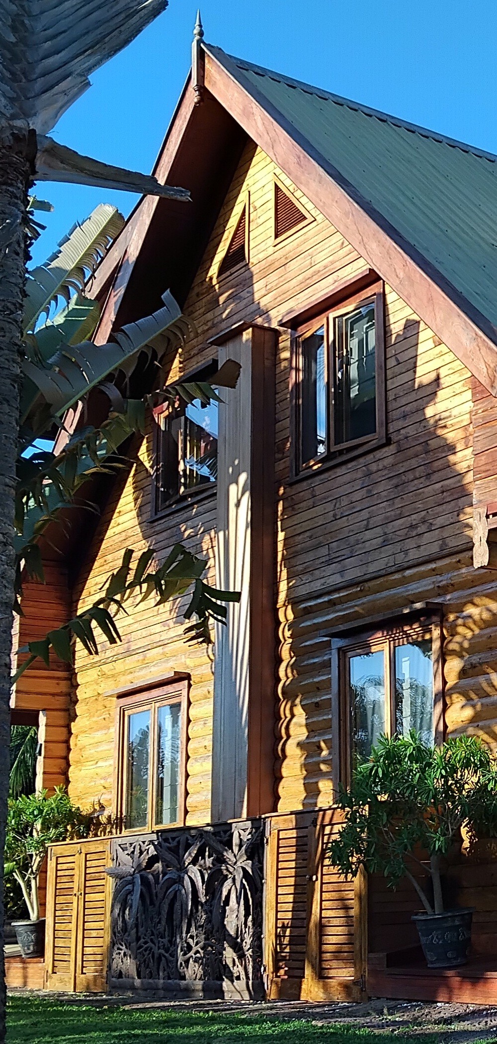 - On the west side of this amazing villa, the AC units are protected by metal handmade palm artwork and handmade green heart cupboards – more storage.