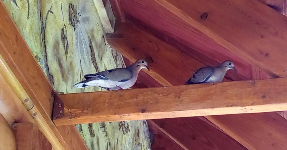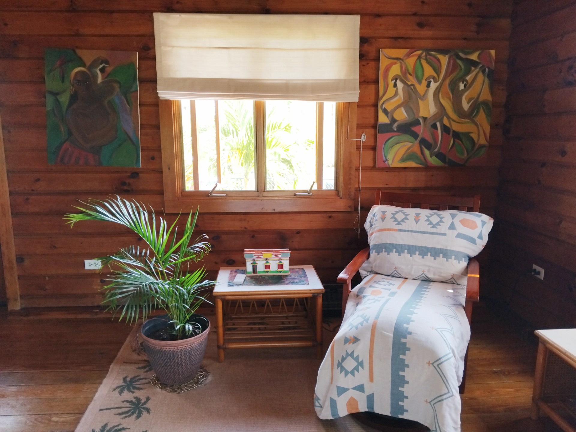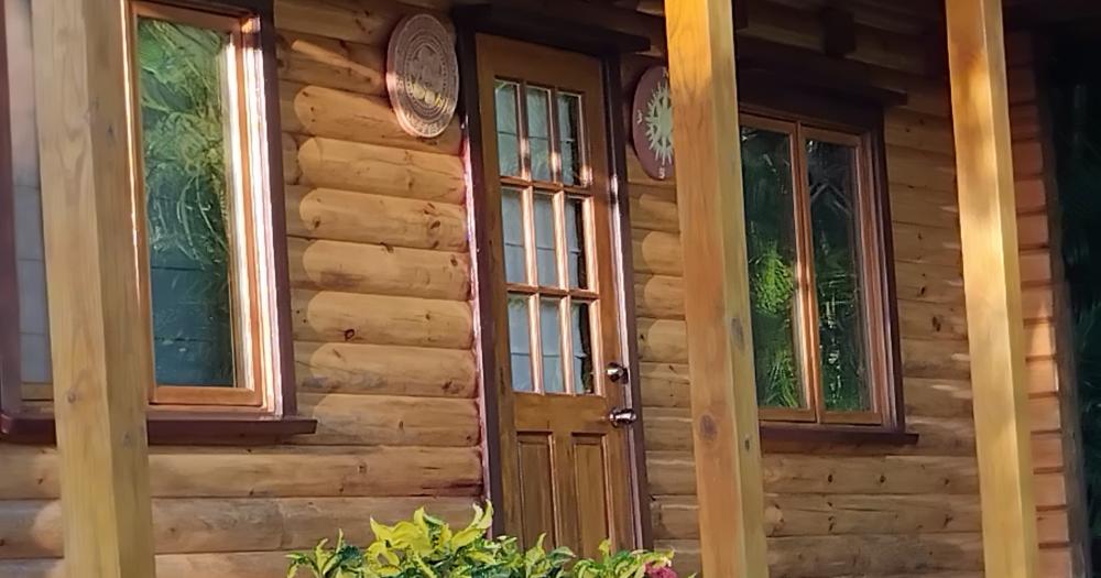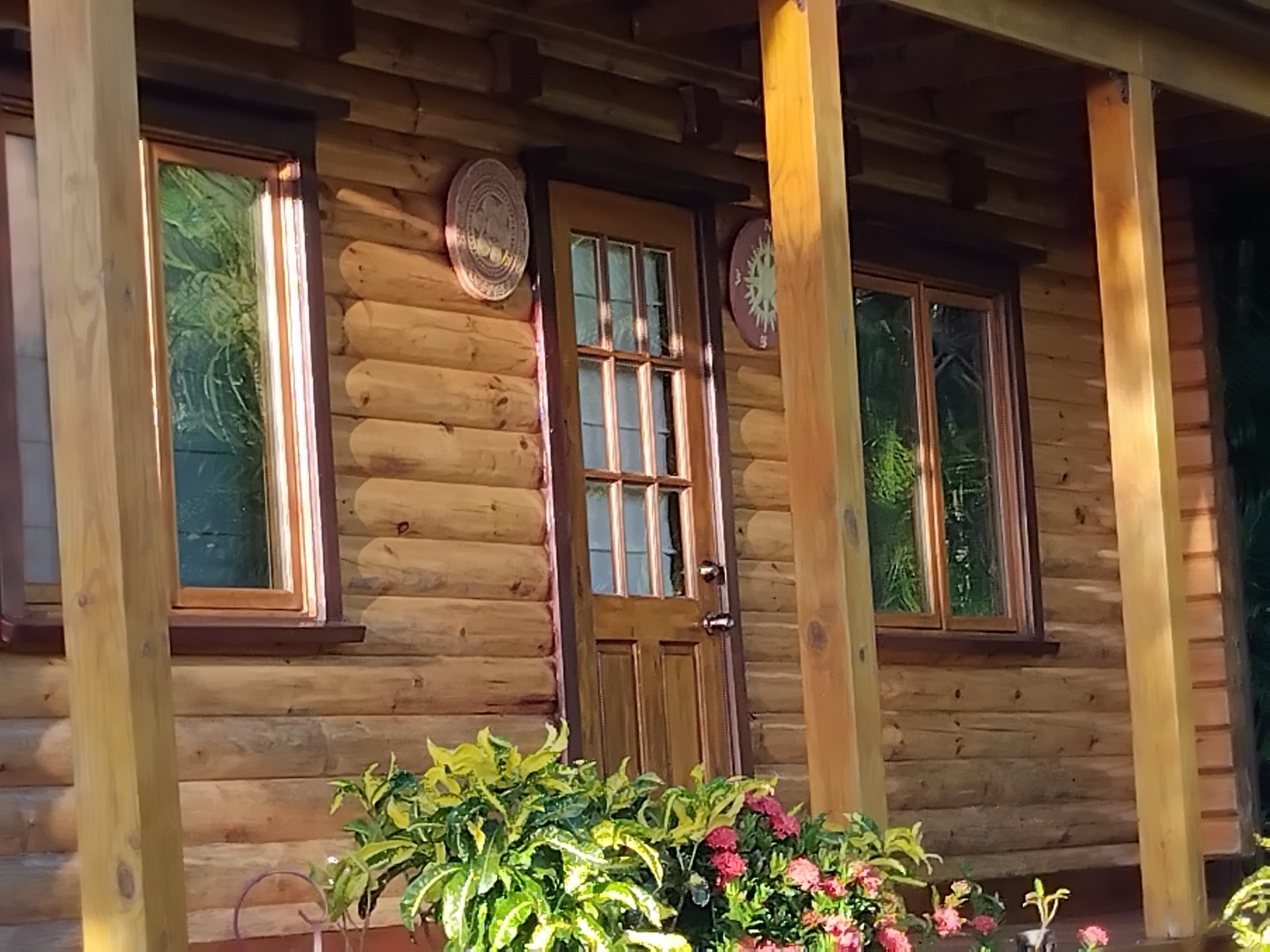- Above the cedar logs of the front deck is a beam with local hand-painted artwork.