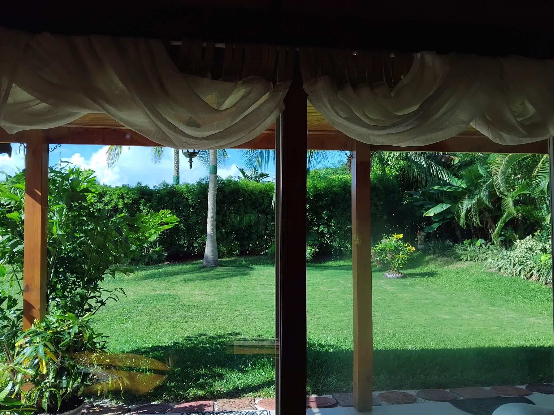 - The rear, large, very private patio is tiled. Above its wood ceiling is hidden, lit, waterproof, outdoor storage. This patio is a beautiful secluded space to dine, socialize, study, remote work, relax, play or just lay on the hammock gazing out at palms and stars.